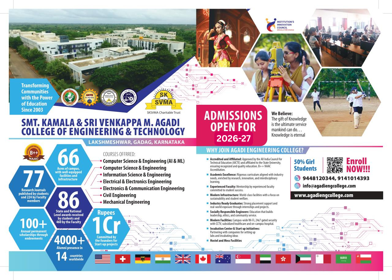 SKSVMACET is an institution founded by the Founder Chairman, the Late, Sri Venkappa M. Agadi, with the dream of transforming his birthplace from a tiny hamlet into a center of excellence.